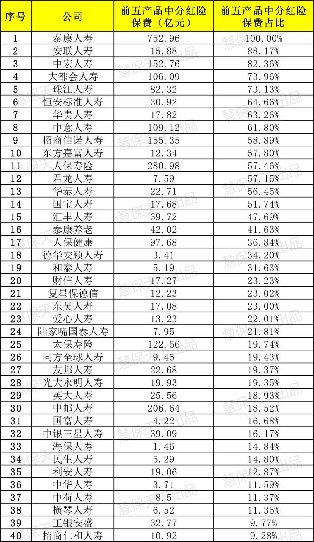这其中,部分公司前五大产品中,分红险保费占比极高,例如泰康人寿,甚至达到了100%的水平,但也有部分险企的前五大产品中,分红险消失不见,例如阳光人寿、长城人寿等10家险企。