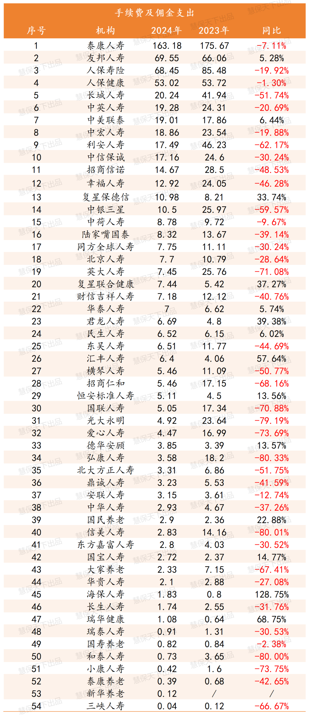 从规模来看,泰康人寿以163.18亿元的手续费及佣金支出居首,即使同比下降7.11%,仍遥遥领先。友邦人寿以69.55亿元位列第二,且是少数支出仍同比上升的头部公司之一。紧随其后的是人保寿险、人保健康,手续费及佣金支出分别为68.45亿元、53.02亿元。