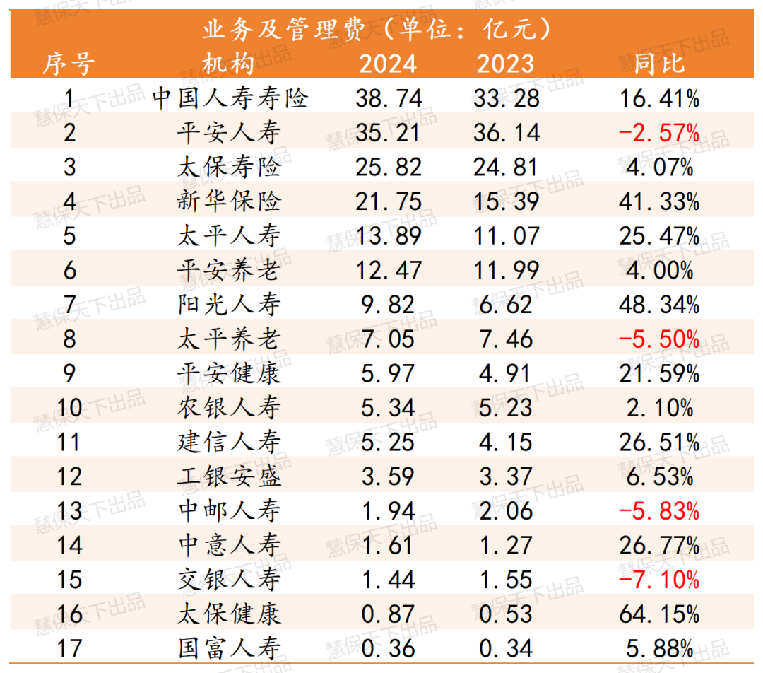 从规模来看,2024年,业务规模最大的国寿寿险,其业务及管理费也居于首位,达到38.74亿元,同比增长16.41%;平安人寿支出35.21亿元,同比下降2.57%;太保寿险为25.82亿元,同比增长4.07%。中邮人寿、中意人寿、交银人寿、太保健康、国富人寿等险企业务及管理费用成本则较小,均不足2亿元。