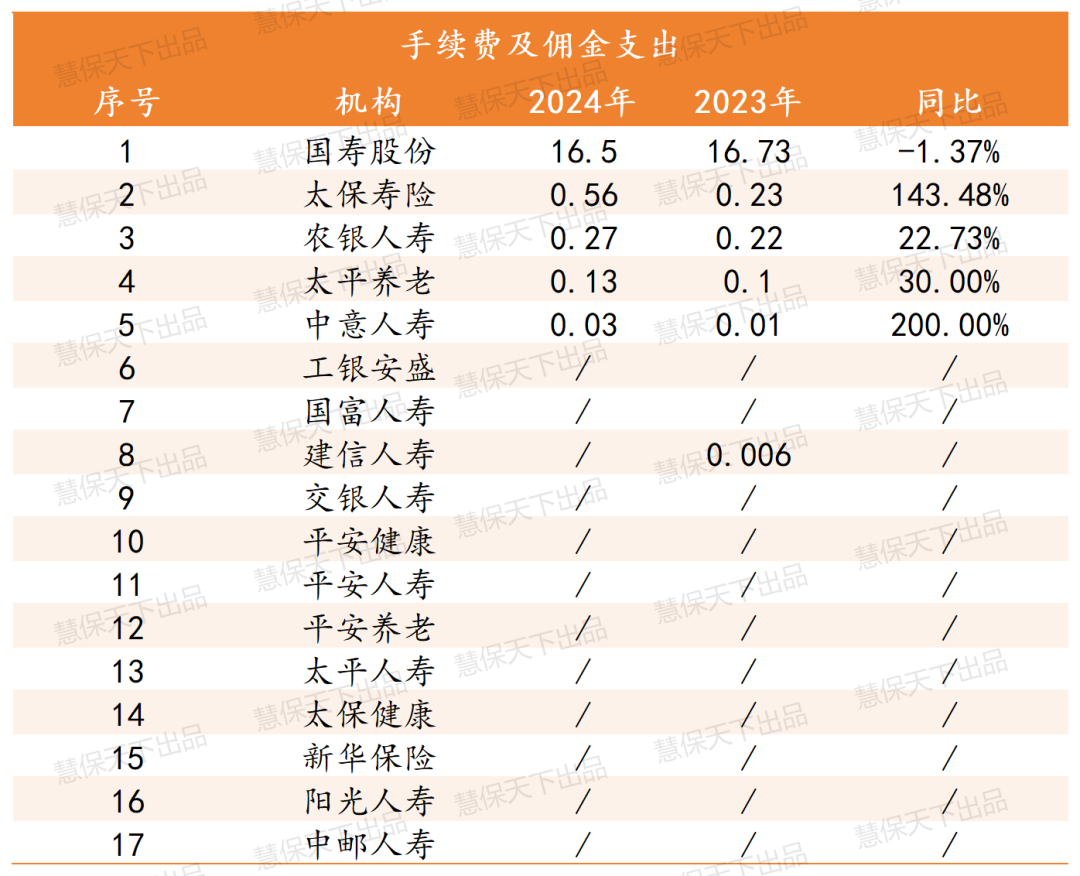 另据『慧保天下』统计,2024年,共有17家险企已采用新会计准则口径,其中仅有5家(如下图所示)披露了手续费及佣金支出,合计支出为17.49亿元,较去年同期的17.29亿元略有增长,同比上涨1.16%。