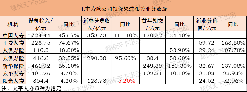 近期,上市险企中期报告中的多个大幅增长的数据,尤其是多个超过100%的数据,更是充分展现了这一历史性转变。例如,A股五大上市险企银保渠道总保费收入平均增幅为57.36%,中国人寿银保渠道新单保费同比增长111.10%,平安人寿银保渠道新业务价值同比增长168.6%,新华保险银保渠道首年期交保费同比增长150.30%……