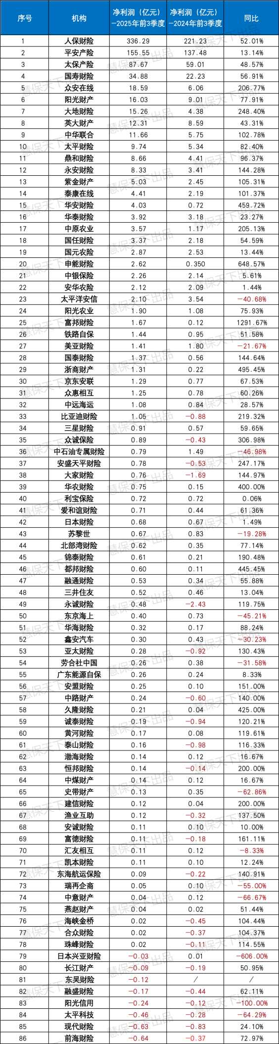 行业“马太效应”在盈利端表现得尤为显著。人保财险、平安产险、太保产险“老三家”合计实现净利润579.51亿元,占行业总盈利的74.47%,虽较2024年的81.45%略有回落,但仍牢牢掌握行业盈利主导权。其中人保财险以336.29亿元净利润居首,同比增幅达52.01%;平安产险、太保产险分别实现155.55亿元、87.67亿元净利润,增速分别为13.14%、48.57%,三家盈利规模已超过其余82家险企盈利总和的两倍。