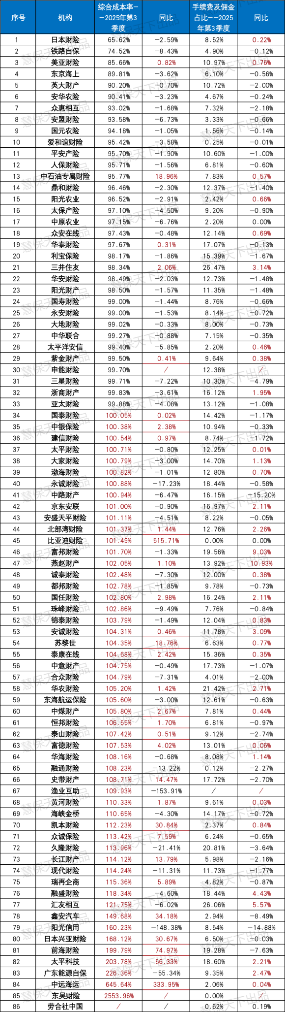 前海财险、太平科技、中远海运等机构综合成本率分别高达199.79%、203.78%、645.64%,承保亏损严重;华农财险等机构因手续费及佣金占比升至21.42%,费用端压力进一步挤压盈利空间。即便部分中小机构成本率同比改善,如汇友相互、凯本财险等降幅超5个百分点,但仍未脱离承保亏损区间,成本管控的长效机制尚未形成。