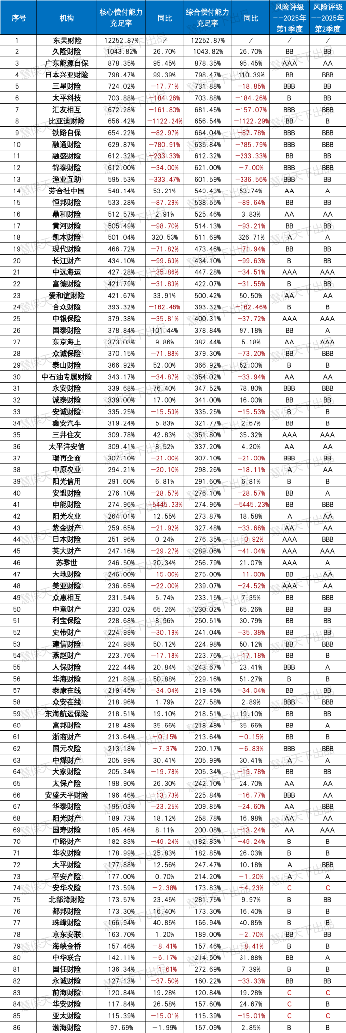 值得肯定的是,北部湾财险从B级升至BB级,安盛天平财险从BBB级跃升至AA级,其背后是增资扩股、业务结构优化与风险管控强化的协同作用,为中小险企偿付能力改善提供了可借鉴的路径。