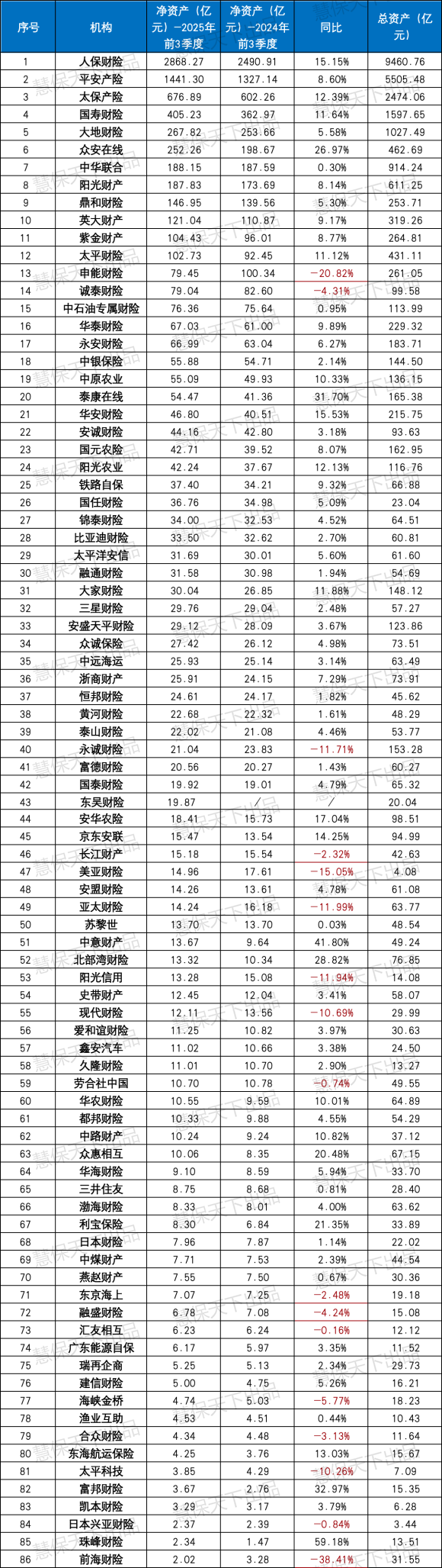 头部机构主导了净资产的增长格局。人保财险、平安产险、太保产险合计净资产5006.46亿元,占行业整体的57.12%;三家净资产同比增量合计489.52亿元,贡献了行业71.83%的净资产增长,人保财险以2868.27亿元净资产居首,较2024年同期增长15.15%,盈利留存成为其资本补充的核心来源。中小机构中,锦泰财险通过资本公积转增注册资本增资8.09亿元,富邦财险则凭借盈利积累实现净资产32.97%的高增长,资本实力显著提升。