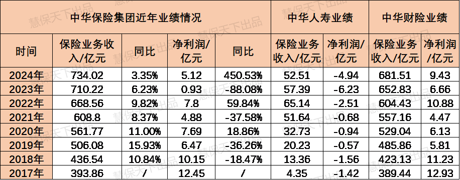 重用年轻化专业人士的背后,或许是中华保险对业绩增长的强烈渴求。慧保天下梳理了近几年中华联合保险集团的业绩情况,可以看到,一方面,集团总的保险业务收入呈现明显的放缓趋势,尤其是2024年,增速仅有3.35%,已经远低于行业平均增幅;另一方面,净利润呈现出较大波动,而从构成来看,净利润也基本由财险子公司贡献,中华财险长期位于国内财险市场第五,而寿险子公司一直处于亏损状态,累计亏损已超过18亿元。