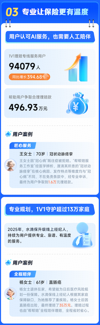 2025年,通过普惠产品创新、AI赋能提效、专业服务的多维协同,水滴保不仅实现了服务效率的飞跃,更深化了保障的广度与温度。未来,水滴保将以AI驱动“三好服务”升级,打造更高效贴心的保险体验。